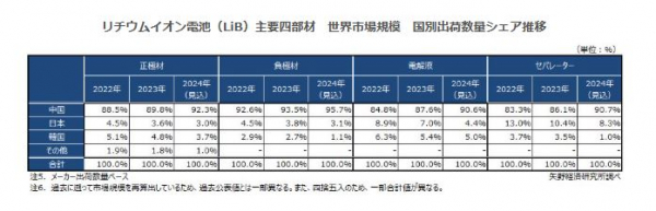 2024年のLiB主要四部材世界市場における国別出荷数量シェア(見込)をみると、中国LiB部材メーカーの出荷量は四部材全てで9割を超える状況となった。