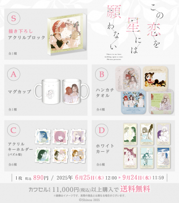 S賞アクリルブロックは「カワセルくじ」だけの限定描き下ろしイラストを使用!その他の賞も、カラーイラストや作中から厳選したコマを使用したデザインとなっており、「この恋を星には願わない」の世界観を存分にお楽しみいただけます。