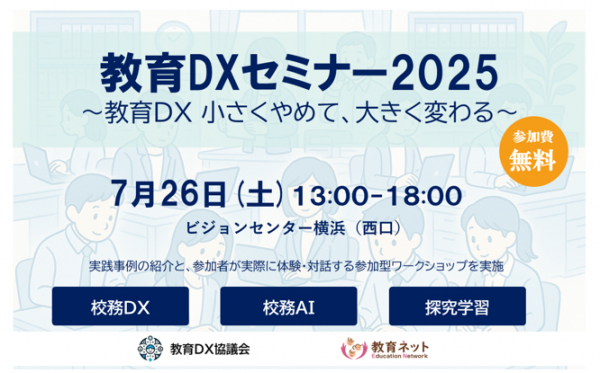 株式会社教育ネット(神奈川県横浜市都筑区 代表:大笹いづみ)は、「教育DXセミナー2025」(主催: 一般社団法人 教育DX協議会、運営:株式会社教育ネット)を7月26日(土)に開催いたします。本セミナーでは、教育現場で注目されている「校務DX」「校務AI」「探究学習」の3つのテーマを軸に、教育委員会や現場教員による実践事例の紹介と、参加者が実際に体験・対話する参加型ワークショップを実施します。