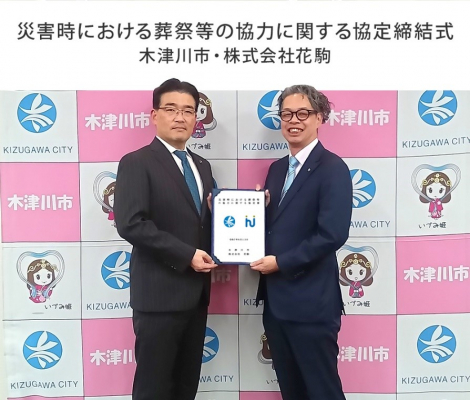 株式会社きずなホールディングス(本社:東京都港区、代表取締役社長 兼 グループCEO:中道 康彰)の葬祭事業会社で、木津川市内で家族葬ホール「イマージュホール木津川」を運営している株式会社花駒(本社:京都府相楽郡精華町、代表取締役:上野 雄一郎)は、木津川市(京都府木津川市、市長:谷口 雄一氏)と「災害時における葬祭等の協力に関する協定」を、2025年6月13日に締結しました。