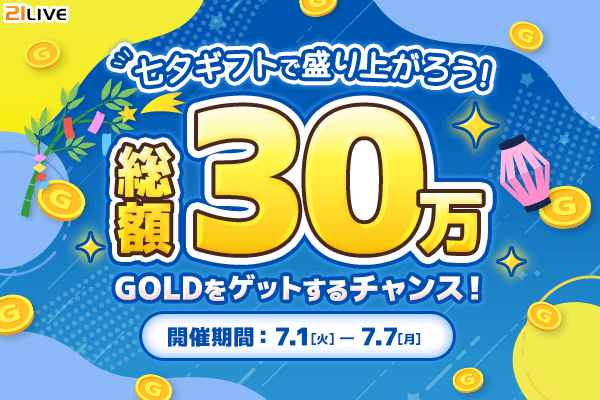 株式会社エムアンドティーティー(本社:沖縄県北谷町、代表取締役:井藤 三知子)が運営するエンターテイメント・ライブ配信アプリ【21LIVE(ニーイチライブ)】URL: https://21.live では、7月1日(火)より『七夕ギフトで盛り上がろう!総額30万GOLDをゲットするチャンス!』を開催いたします。