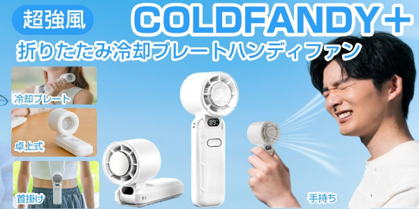 COLDFANDY+(コールドファンディプラス)は、冷却プレートと5段階風量のハンディファンを組み合わせたダブルで涼しいハンディファンです。数秒で冷却プレートがひんやり冷たくなり、外気温より最大約-20℃(※理論値)の温度差で首筋や頬に当てるだけで即座に涼しい。手持ち・首掛け・卓上の3WAY方式で場所を選ばず使えるので、通勤通学、デスクワーク、アウトドア、スポーツ観戦、イベント、さらに猛暑でも外出を避けられないビジネスパーソンや現場作業など夏のあらゆるシーンで活躍します。風量・冷却モード・バッテリー残量がディスプレイに表示され、USB充電式で繰り返し使えるから長時間の外出時でも安心です。