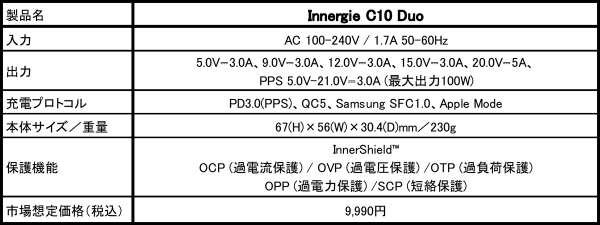 賞 品:100W GaNデュアルポートUSB-C急速充電器「Innergie C10 Duo」を抽選で2名様に進呈
