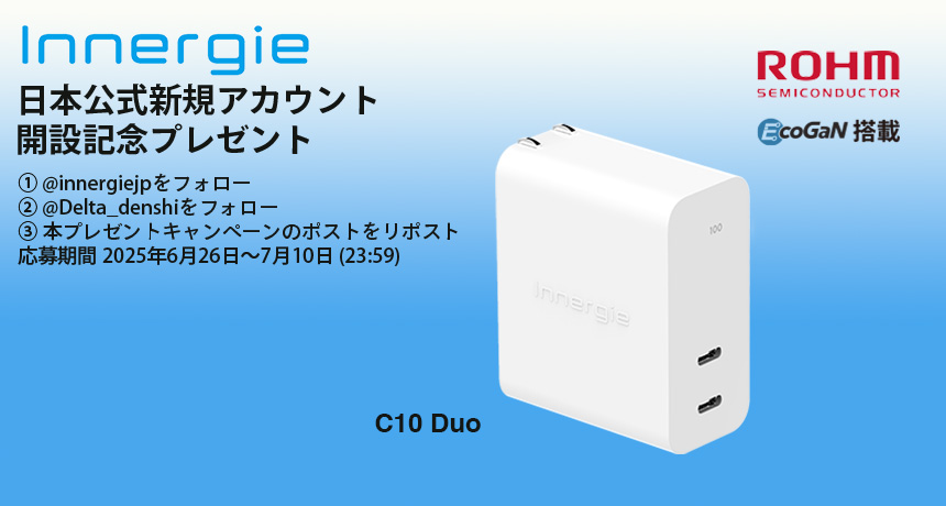 キャンペーン賞品の「Innergie C10 Duo」は、GaN(窒化ガリウム)半導体にローム株式会社(京都府左京区)のEcoGaNを採用し、GaNの性能を最大限活かしつつ、省電力性の向上とデバイスの小型化を可能にしています。また、電力技術の世界的リーダーである台湾本社Delta Electronics, Inc.を筆頭とするデルタグループが50年以上にわたって培ってきた専門的な電源管理技術と組み合わせることですぐれた品質と信頼性を実現しています。