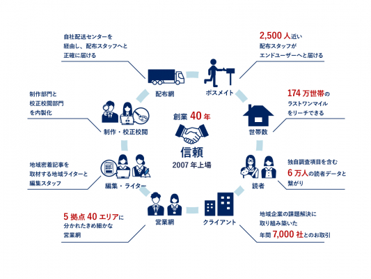 当社は、地域密着型の生活情報誌『ちいき新聞』の発行を軸に、情報発信および販売促進の総合支援事業を展開しており、年間約7,000社にサービスを提供しています。千葉県を中心に毎週発行している『ちいき新聞』は、専属の配布員により174万世帯へポスティングされ、創業以来40年以上にわたり配布を継続してきたことで、他に類を見ない9つのアセットを築いてきました。