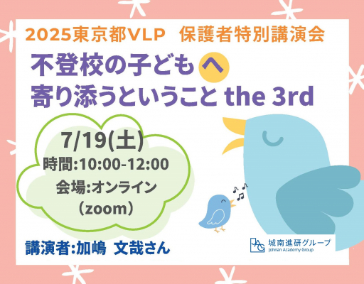 株式会社城南進学研究社(本社:神奈川県川崎市、代表取締役社長CEO:下村勝己、以下「当社」)は、2025年7月19日(土)、東京都が提供する「バーチャル・ラーニング・プラットフォーム(VLP)※」特別イベントとして、不登校のお子様を持つ保護者を対象とした特別講演会「不登校の子供へ寄り添うということ the 3rd」を開催します。