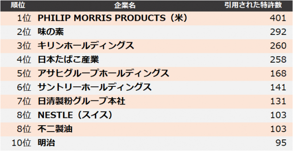 4位 日本たばこ産業は「非燃焼型喫煙物品用シート」、5位 アサヒグループホールディングスは「ビールらしい風味を付与したり増強できるビール凍結乾燥物を含む風味改善剤」が、最も引用された特許として挙げられます。