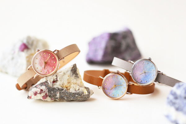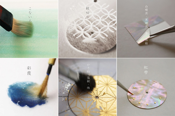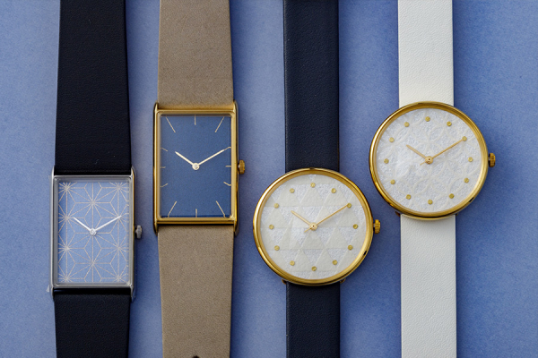 複数色の岩絵具を塗り、抽象的な絵画のような一点ものの「彩霞」、胡粉で白く染めた和紙を伝統的な紋様にカットワークして載せた「紋切」、多彩な表情を持つ貝を文字盤に使った「虹雫」。漆や螺鈿、蒔絵といった伝統的な技法で作られる文字盤の時計など手作業でしか表現できない繊細な魅力が詰まった商品です。