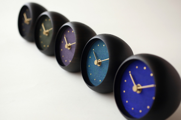 コロンとした柔らかなフォルムの「はなもっこ置時計」は、同じく文字盤に、手漉きの和紙をベースに岩絵具を塗り重ね、インデックスには金箔、フレームの部分は、山中漆器の伝統技法「ろくろ引き」でけやきで作られています。時間を見る時計としての機能だけでなく、古来の色を愉しむオブジェのような時計です。裏に刻印も入れられるので、大切な方へのギフトにもおすすめです。