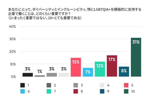 本調査では、多様性&インクルージョンの取り組みが、日本におけるプロフェッショナルのキャリア選択において重要な要素となっていることが明らかになりました。多様性とインクルージョン、特にLGBTQIA+を積極的に支持する企業で働くことの重要性を1から10の尺度で回答してもらったところ、31%が「とても重要である(10)」と評価し、さらに25%が「重要である(8~9)」と評価しました。「重要でない(1~3)」と回答したのは昨年の9%を下回る7%で、インクルーシブな職場文化は重視される傾向にあることがわかります。