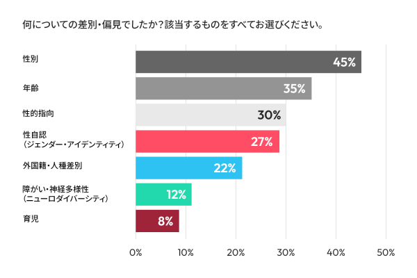 差別・偏見の種類においても昨年の調査結果に比べて主要なカテゴリーで改善が見られます。年齢による差別は46%から35%に、性的指向による差別は44%から30%に、性自認による差別は37%から27%に減少しました。性別に基づく差別は45%で最も多く見られ、前述の項目に続き、外国籍/人種(22%)、障害/神経多様性(12%)も差別の要因となっています。前回の調査結果から徐々な改善の兆しは見られるものの、職場の様々な場面における差別・偏見はまだまだ存在し、なくすための継続的な取り組みが引き続き必要とされています。