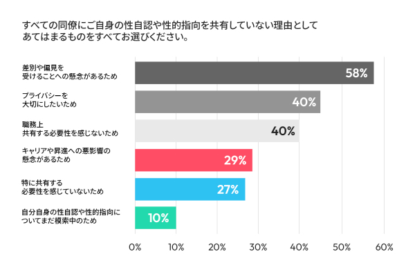 職場で自身の性自認や性的指向をカミングアウトしない理由について「職務上、共有する必要性を感じないため」(40%)、「特に共有する必要性を感じていないため」(27%)など、中立的な理由も挙げる人もいた一方で、58%が「差別や偏見を受けることへの懸念があるため」と答え、29%が「キャリアや昇進に悪影響があるのではないかという不安があるため」と回答しました。この結果から、職場におけるインクルージョンが重視されているかどうかが、LGBTQIA+の社員が安心して自分らしく働けるかどうかに深く関係していることが分かります。また、インクルーシブな環境の有無が、キャリアアップの機会にも影響を与えると考えられているようです。