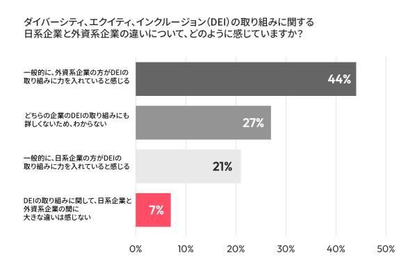 下記のグラフから、外資系企業と日系企業の間で「多様性・公平性・インクルージョン(DEI)」への取り組みに大きな違いがあると感じている人が多いことがわかります。44%の回答者が「一般的に、外資系企業の方がDEIの取り組みに力を入れていると感じる」と答えた一方で、「日系企業の方が力を入れていると感じる」と答えた人は21%にとどまりました。