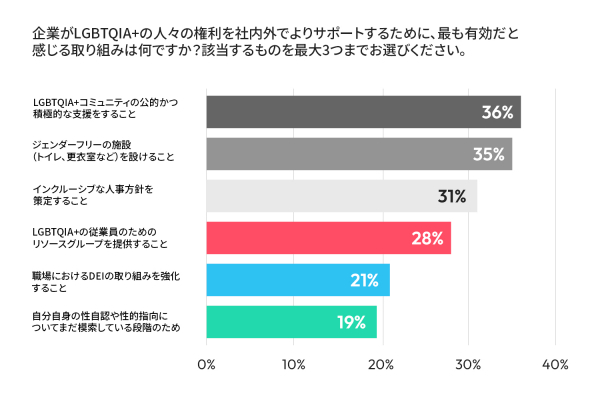 最も多くの支持を集めた取り組みは、「LGBTQIA+コミュニティの公的かつ積極的な支援をすること」(36%)、「ジェンダーフリーの施設(トイレ、更衣室など)を設けること」(35%)、「インクルーシブな人事方針(差別禁止方針、同性パートナーに対する平等な福利厚生など)を策定すること」(31%)でした。そのほかの優先事項としては、「LGBTQIA+の従業員のためのリソースグループ***を提供すること」(28%)、「職場におけるDEIの取り組みを強化すること(セミナーや研修への参加を含む)」(21%)、「トランスジェンダー医療保険/性別移行支援を提供すること」(19%)などが挙げられました。