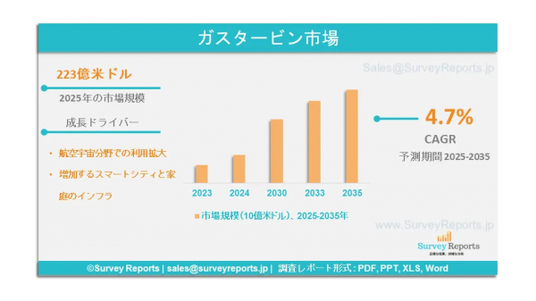 Survey Reports LLCは、2025年6月に「ガスタービン市場:容量別(1-2 MW、2-5 MW、5-7.5 MW、7.5-10 MW、10-15 MW、15-20 MW、20-30 MW、30-40 MW、 40-100 MW、100-150 MW、150-300 MW、および300+ MW)、技術別(重負荷型、軽工業用、航空機派生型)、サイクル別(単純サイクル、複合サイクル)、セクター別(電力事業、石油・ガス、製造業、航空、その他) - 2025年から2035年までのグローバル市場分析、動向、機会、および予測。本レポートは、ガスタービン市場の予測評価を提供します。ガスタービン市場における成長要因、市場機会、課題、および脅威を含む、複数の主要な市場動向を強調しています。