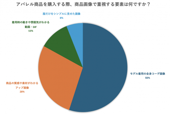 ネットでアパレル商品を購入する際、消費者は商品の「モデル着用全身コーディネート画像」を最も重視していることが今回の調査でわかりました。具体的な着用イメージを掴むことで、サイズ感やシルエット、コーディネートの雰囲気が把握しやすいためです。