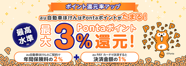 さらに、au PAY カードでお支払いの場合、au PAY カードのご利用100円(税込) ごとにPontaポイントが1ポイント(還元率1%)たまります。2%の還元とあわせて、合計で保険料の最大3%のPontaポイントがたまります。
