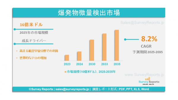 Survey Reports LLCは、2025年6月に「爆発物微量検出市場セグメンテーション(製品別(ハンドヘルド、ポータブル/移動式、固定式/スタンドアロン)、技術別(色度測定法、イオン移動スペクトロメトリー、熱酸化還元反応、化学発光、増幅蛍光ポリマー) 用途別(商業、防衛、公共安全・法執行、その他)- グローバル市場分析、動向、機会、および予測(2025-2035年)」を発表しました。この報告書は、爆発物微量検出市場の予測評価を提供し、市場成長の要因、市場機会、課題、および脅威を含む、爆発物微量検出市場の主要な市場動向を強調しています。