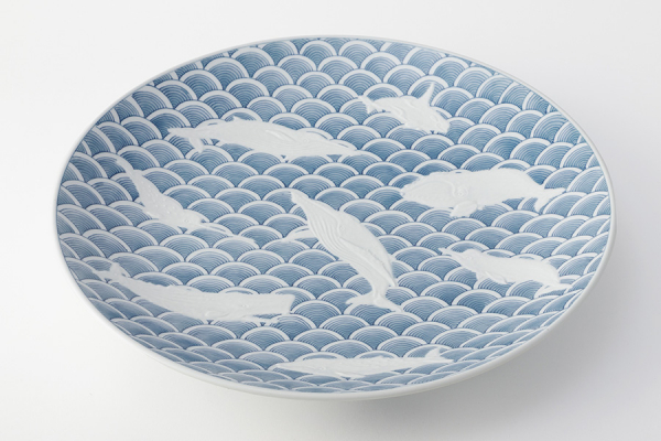 染付の青海波に、今にも動かんばかりの置き上げの鯨を配した、一尺三寸(約40cm)もある大皿は、見応えある逸品。