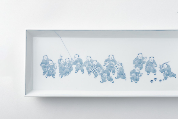 長崎の伝統的な「長崎ハタ(凧)」や「佐世保コマ」で遊ぶ唐子を描いた長角皿。光雲窯らしさ溢れるユーモラスな一枚。
