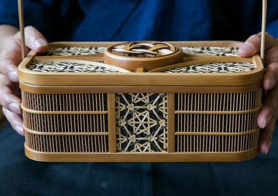 優美な曲線と繊細な直線による独特の意匠は、編んで作られる一般的な竹細工と異なり、細く丸く削った竹の「丸ひご」を輪に組み込むという技法から生まれます。