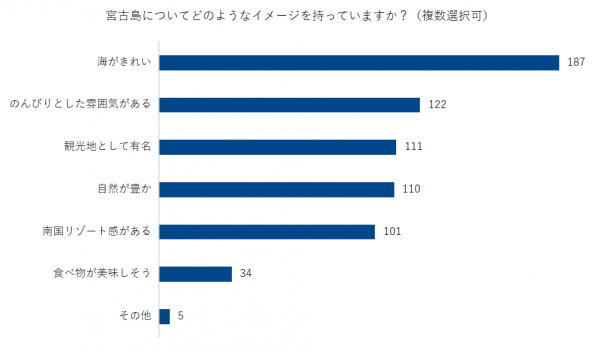 宮古島のイメージについてたずねたところ、最も多かったのが「海がきれい」で187人でした。次いで、「のんびりとした雰囲気がある」122人、「観光地として有名」111人、「自然が豊か」110人、「南国リゾート感がある」101人と続きます。