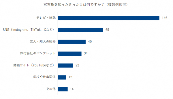宮古島を知ったきっかけとしては、「テレビ・雑誌」が146人と圧倒的多数を占めました。続いて「SNS(Instagram、TikTok、Xなど)」65人、「友人・知人の紹介」40人、「旅行会社のパンフレット」34人、「動画サイト(YouTubeなど)」22人、「学校や仕事関係」12人、「その他」14人という結果となりました。