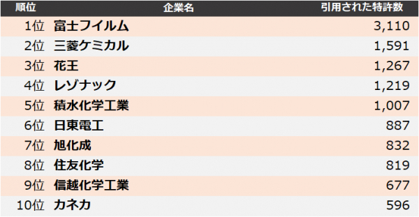 集計の結果、2024年に最も引用された企業は、1位 富士フイルム、2位 三菱ケミカル、3位 花王となりました。