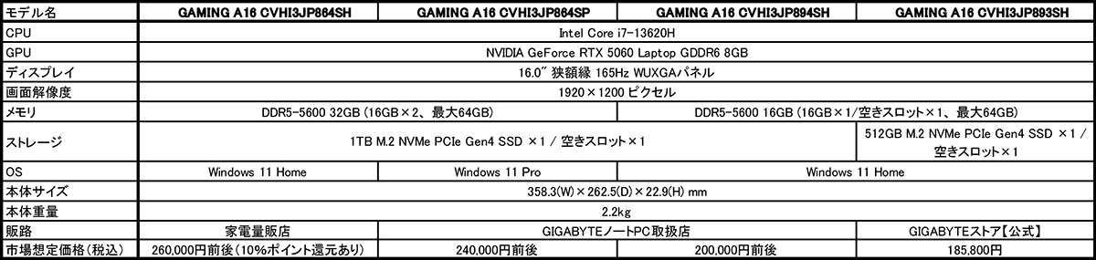 2025年7月4日 - GIGABYTE Technology Co., Ltd. 台湾・新北市 - コンピュータテクノロジーで世界をリードするGIGABYTE Technologyは、CPUに第13世代Intel Core i7プロセッサ、GPUにNVIDIA GeForce RTX 5060 Laptop GPUを搭載したエントリー向け16.0型AIゲーミングノートPC「GIGABYTE GAMING A16シリーズ」4モデルを、家電量販店(ソフマップ、ビックカメラ、ヨドバシカメラ)、GIGABYTEノートPC取扱店およびGIGABYTEノートPC直販サイト「GIGABYTEストア【公式】」を通して7月11日より販売を開始いたします。