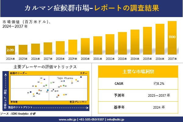 SDKI Analytics(本社:東京都渋谷区)は、このたび、2025年07月02に「カルマン症候群市場調査レポート:2025-2037年の市場規模、シェア、傾向の予測」を発表しました。カルマン症候群に関する市場調査レポートには、統計的及び分析的アプローチを使用した予測評価が含まれています。この調査レポートでは、一次及び二次調査方法を使用して分析された主要な業界洞察を通じて将来の傾向を理解できるようにすることで、主要な市場傾向を読者に説明しています。