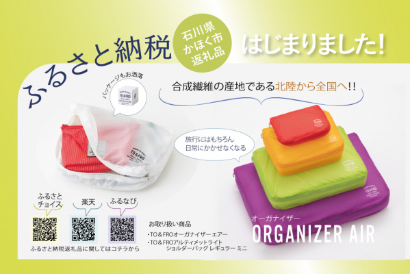 この度、TO&FROの「オーガナイザーエアー」と「アルティメットライトショルダーバッグ」が、石川県かほく市のふるさと納税返礼品に採用されました。これらのアイテムは、髪の毛よりも細い極細糸を、ファクトリーブランドならではの技術で織りあげたオリジナル生地の「Humming bird AIR(ハミングバード エア)」を使い、TO&FROの一番の魅力である"軽さ"を手にした瞬間に感じていただけるアイテムです。