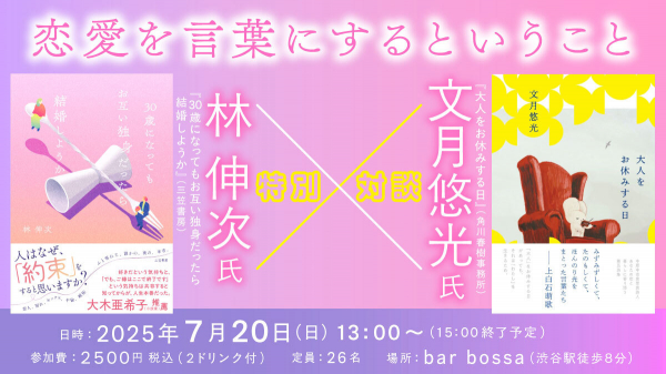 イベントでは、「恋愛を言葉にする」ということについて、エッセイを書かれる林氏と、詩・エッセイを書かれる文月氏それぞれの想いや考えについて語っていただきます。