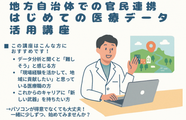厚生労働省が推進する「高齢者の保健事業と介護予防の一体的実施」など、医療・介護分野でもデータに基づいた施策立案が必須となっています。しかし現場では「統計が苦手」「IT が不安」と感じる専門職も多いのが実情です。本講座は、そうした課題を抱える方に向け、初学者でも安心して学べるカリキュラムを提供します。