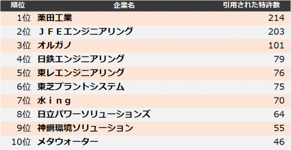 集計の結果、2024年に最も引用された企業は、1位 栗田工業、2位 JFEエンジニアリング、3位 オルガノとなりました。