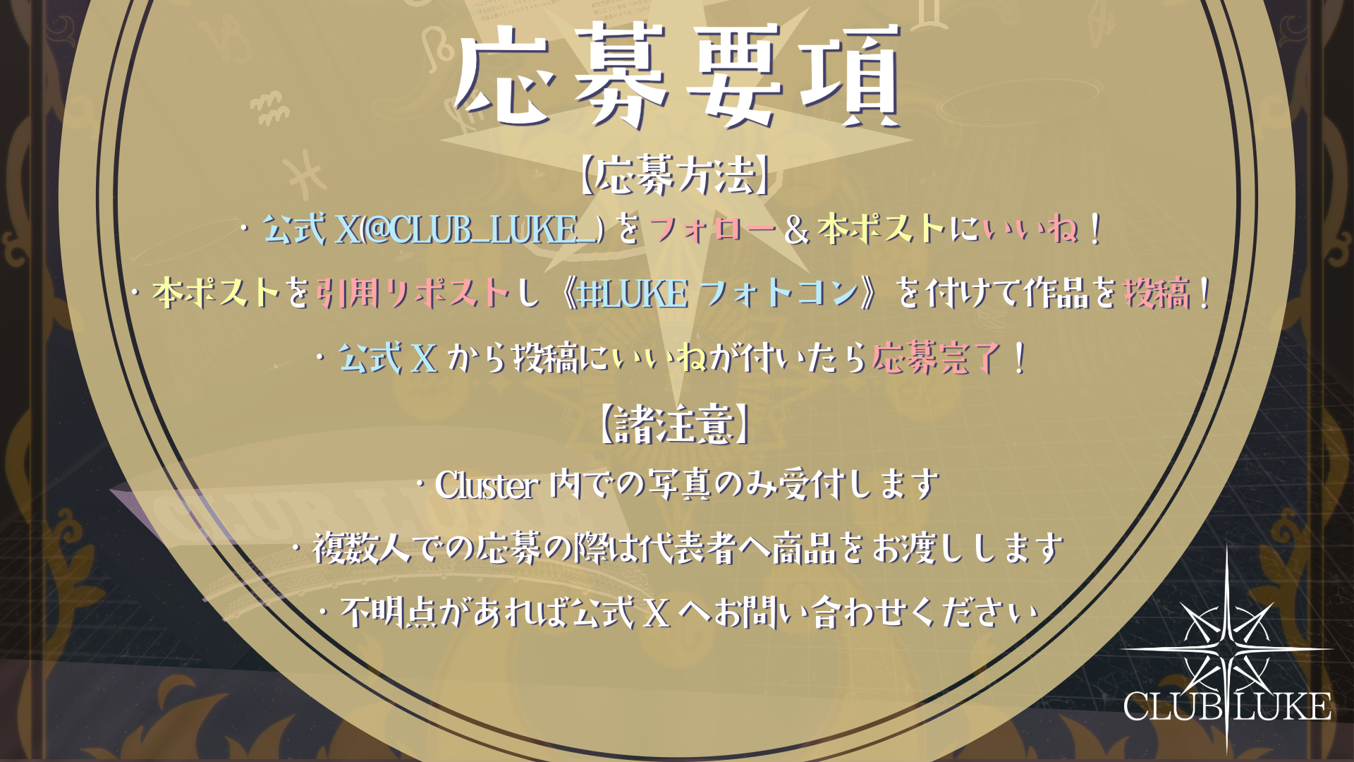 応募方法 :Xで @CLUB_LUKE_ をフォローの上、所定のポストを引用した上で 「#LUKEフォトコン」タグを付けて投稿