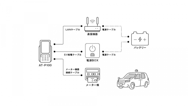 (*1)タクシー専用メーター連動決済端末「AT-P100」は、通信機器SkyBridge「MB-A130」(セイコーソリューションズ提供)と合わせて利用することで、無線決済端末として利用できます。SIM搭載で無線通信が可能なモバイル決済端末(メーター非連動型)をお選びいただくことも可能です。