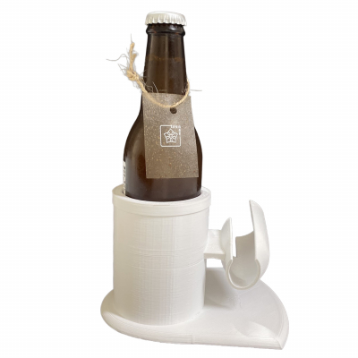 当社は本イベントに合わせ、協賛ブランドのひとつである「Tsunagi」のために「VR飲みを楽しむコントローラーホルダー」向けアタッチメントを開発。同ビールの瓶を固定できるようにしました。