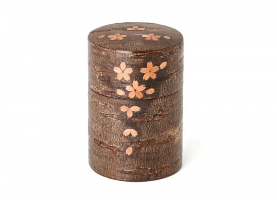 藤木伝四郎商店のスタンダードな茶筒「総皮茶筒 霜降皮」に桜の花びらが舞い散る情景を桜皮で表現した茶筒。日々、使い込むほどに落ち着いた色味に変化していきます。