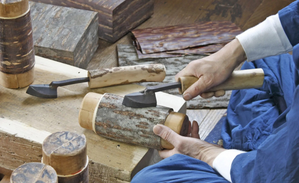 茶筒のパーツである外芯、内芯、外蓋、内蓋を同じ1本の筒から作りだすことで、湿度が変わっても高い密閉性を保つことができるのです。素材となる山桜は殺菌効果・密閉性が優れて、樹木皮の特性上で茶葉の品質を保つに最適な逸品。