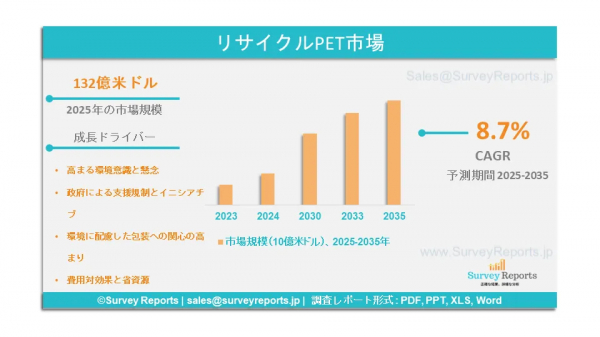 Survey Reports LLCは、2025年7月に「リサイクルPET市場」に関する調査報告書を発行しました。同報告書は、リサイクルPET市場を「タイプ」(RPETフレーク、RPETチップ)、「グレード」(グレードA、グレード)、「用途」(ボトル、繊維、シート、ストラップ、その他)のセグメント別に分析しています。ソース(ボトルと容器、フィルムとシート、その他);色(透明、着色)- グローバル市場分析、動向、機会、および予測、2025-2035」を発表しました。この報告書は、リサイクルPET市場の予測評価を提供し、成長要因、市場機会、課題、およびリサイクルPET市場に対する脅威を含む、複数の主要な市場動向を強調しています。
