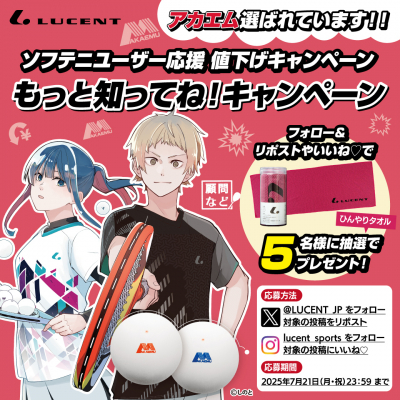 このたび2025年7月7日(月)から、「ソフテニユーザー応援 値下げキャンペーン」をたくさんのソフテニユーザーに知ってもらうためのプレゼントキャンペーン「ソフテニユーザー応援【もっと知ってね!キャンペーン】」を、ルーセントの公式SNSにて開始しました。期間は2025年7月21日(月・祝)までとなります。詳細は下記のURLからご覧ください。