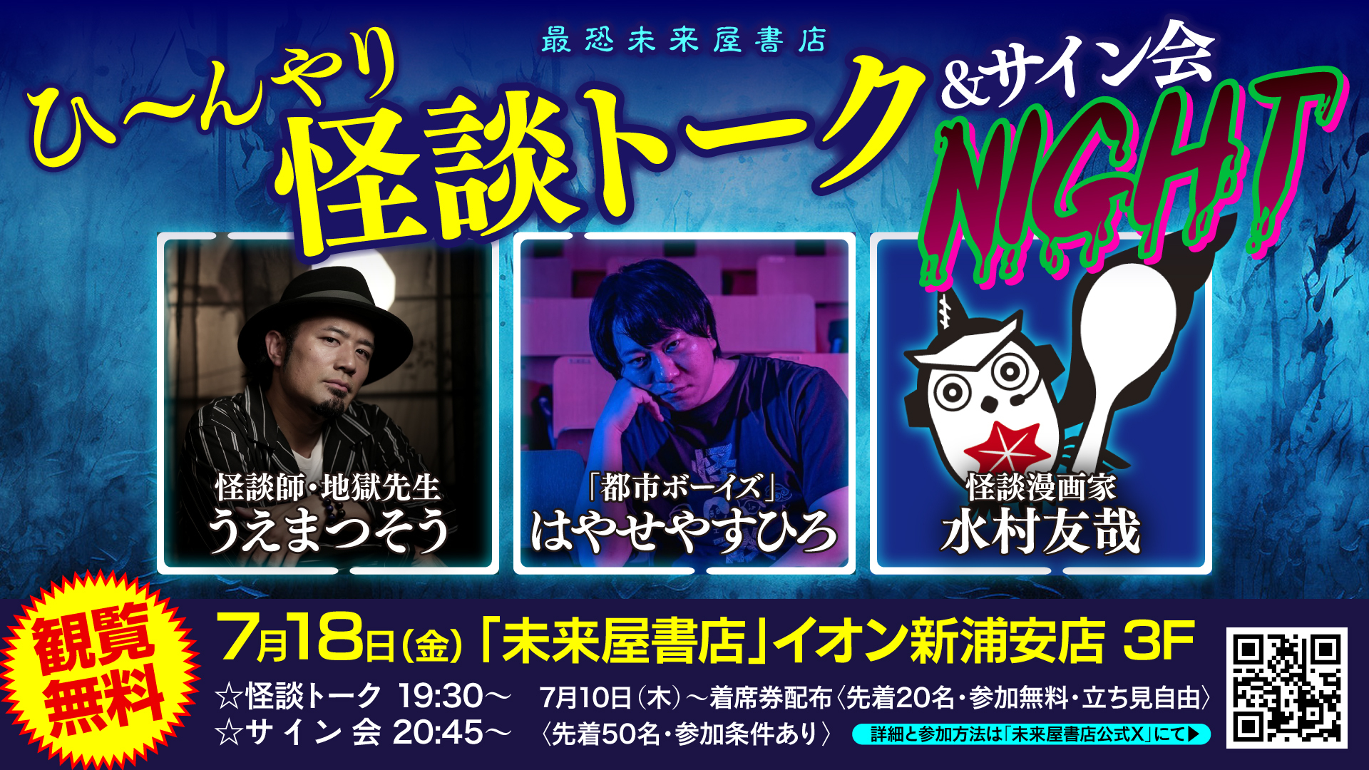 2025年7月18日(金)19:30より、イオン新浦安店3階の未来屋書店 新浦安店にて、暑さを忘れる“戦慄の一夜”をお届けする怪談イベント「ひ~んやり怪談トーク&サイン会NIGHT」が開催されます。