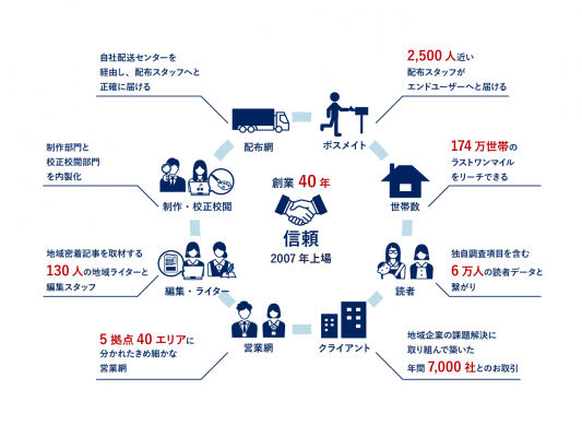 当社は、地域密着型の生活情報誌『ちいき新聞』の発行を軸に、情報発信および販売促進の総合支援事業を展開しており、年間約7,000社にサービスを提供しています。千葉県を中心に毎週発行している『ちいき新聞』は、専属の配布員により174万世帯へポスティングされ、創業以来40年以上にわたり配布を継続してきたことで、他に類を見ない9つのアセットを築いてきました。