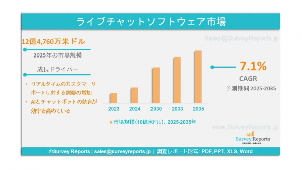Survey Reports LLCは、2025年7月に調査報告書『ライブチャットソフトウェア市場:種類別(カスタマーサービス向けライブチャットシステム、営業向けライブチャットシステム、情報提供向けライブチャットシステム)、エンドユーザー別(医療、BFSI、製薬、通信、IT・コンサルティング、旅行・ホスピタリティ、小売・Eコマース、その他)― 世界市場分析、動向、機会および予測(2025年~2035年)』を発表したと公表した。本報告書は、ライブチャットソフトウェア市場の予測評価を提供するものであり、市場の成長要因、市場機会、課題、および脅威など、複数の主要な市場動向を明らかにしている。