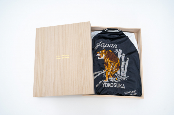 40年以上にわたり木工に携わる職人によって製作された桐箱は、湿気や外気から製品を守る“保管性”はもちろんのこと、美しい箔押しロゴと丁寧な手仕事による佇まいで、スカジャンそのものの価値をさらに高めます。