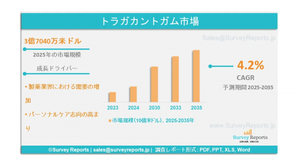 Survey Reports LLCは、2025年7月に『トラガカントガム市場のセグメンテーション:用途別(食品・飲料、医薬品)、原料別(天然トラガカントガム、合成トラガカントガム)、形状別(粉末状、顆粒状)、エンドユーザー別(食品メーカー、製薬企業)、品質グレード別(食品グレード、工業グレード)―世界市場の分析、動向、機会および予測、2025年~2035年』という調査報告書を発表したと公表した。この報告書は、トラガカントガム市場の予測評価を提供しており、成長要因、市場機会、課題、脅威など、複数の主要な市場動向を強調している。