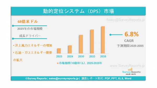 Survey Reports LLCは、2025年7月に『ダイナミックポジショニングシステム(DPS)市場のセグメンテーション:サブシステム別(電力システム、スラスターシステム、DP制御システム)、センサー別(位置基準センサー、風向風速センサー、動作センサー、ジャイロコンパス)、装備タイプ別(クラス1、クラス2、クラス3)、ソリューション別(新造船および改修)、用途別(商業用および軍用)―世界市場の分析、動向、機会および予測、2025年~2035年』という調査報告書を発表したと公表した。