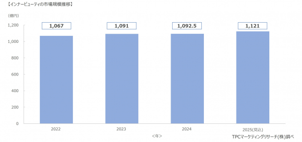 ◆インナービューティ市場は、2015年頃からインバウンド需要の急増や機能性表示食品の制度開始などが要因で急成長を遂げてきたものの、2020年のコロナ禍の影響でインバウンド需要が消失したため市場は大幅に減少した。しかし、コロナ禍を経て近年は内外美容の需要拡大や健康美志向の高まりから国内需要が回復しており、緩やかではあるが市場は拡大傾向にあり、2024年はほぼ前年並みの1,092.5億円となった。