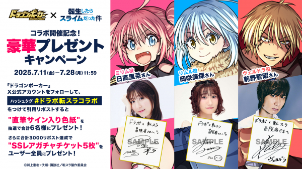 『ドラゴンポーカー』の公式Xアカウント(@DragonPoker_aso)が投稿したキャンペーン対象ポストに「#ドラポ転スラコラボ」をつけて引用リポストして頂いた方の中から抽選で、リムル役「岡咲美保さん」、ヴェルドラ役「前野智昭さん」、ミリム役「日高里菜さん」の直筆サイン色紙いずれかをプレゼント!さらに、合計3000リポスト達成で「SSレアガチャチケット 5枚」を全てのユーザーにプレゼントいたします。奮ってご参加ください。