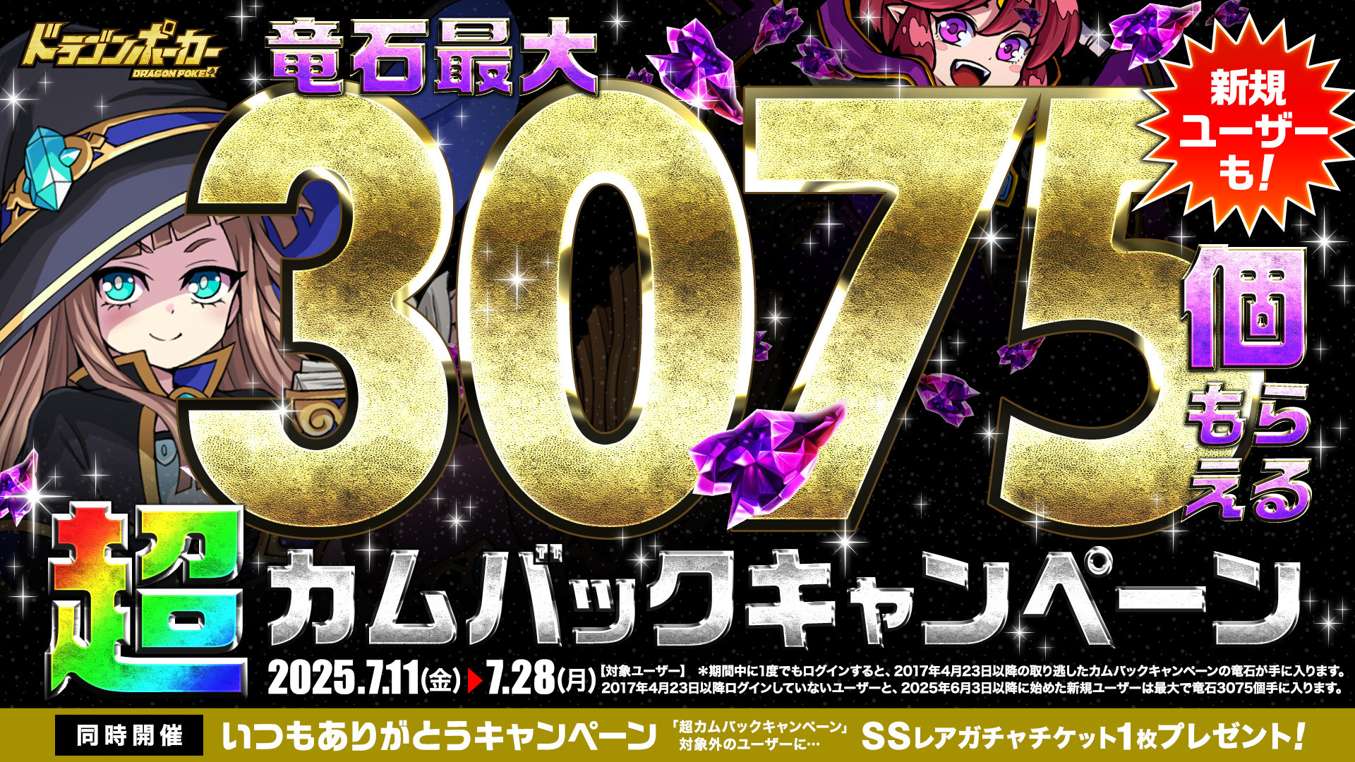 2017年4月23日以降に実施されたカムバックキャンペーンにて、ログインせずに受取れなかった竜石がまとめて手に入ります。2017年4月23日以降のカムバックキャンペーン期間中、ログインしていないユーザーに最大で竜石3075個をプレゼント!さらに、2025年6月3日以降にドラゴンポーカーを始めたユーザーにも竜石3075個プレゼント!これを機会に、ログインして大量の竜石をGETしましょう。また、いつも『ドラゴンポーカー』をプレイして頂いているユーザーの皆様には感謝を込めて、「SSレアガチャチケット1枚」をプレゼントいたします。